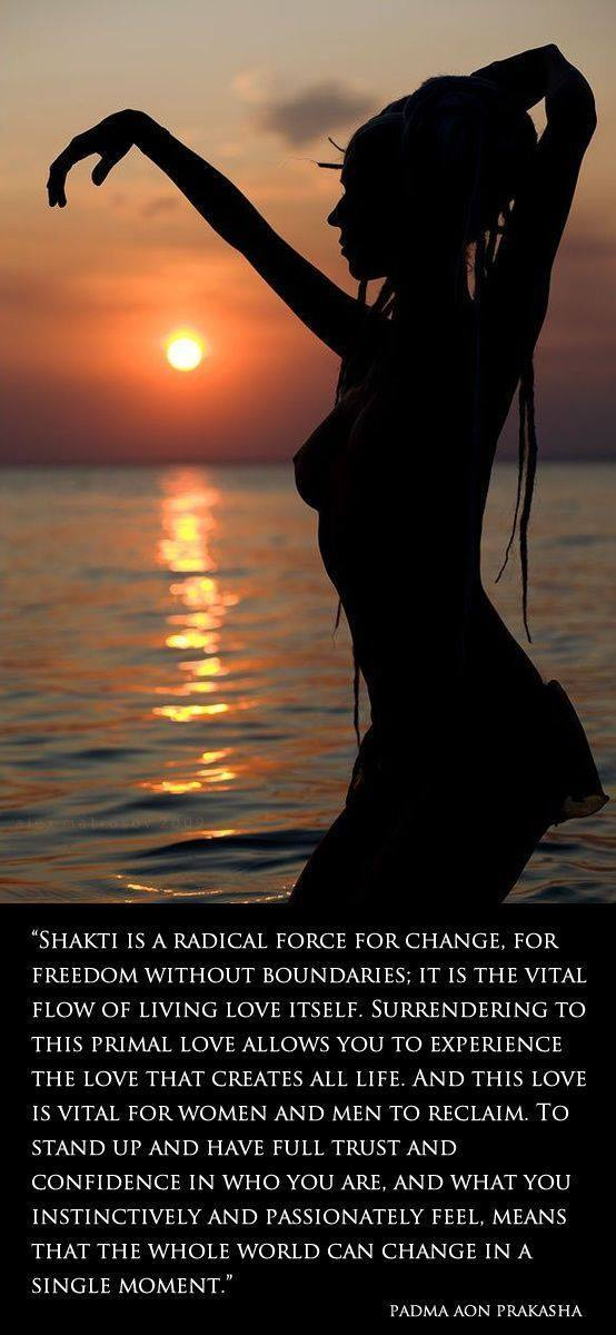 Shakti is love. It leads us to love through its fertile uninhibited force, dissolving all the beliefs that stand in the way of wild joy, the expression of love untrammeled by convention. It says yes to love, and connects all life forms, once you have allowed it to flow through you unchecked, and to take you without reservation